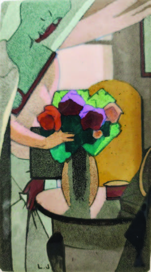 Une plaque de Léon Jouhaud, Femme agençant un bouquet, 1927, de dimensions plus grandes qu’à l’accoutumée, représente au premier plan, un bouquet de pivoines pourpre et mauve aux feuillages vert tendre et émeraude posé sur un guéridon, qu’une fantomatique silhouette féminine agence dans un intérieur sommairement esquissé. L’aspect de cette figure diaphane déconcerte : son visage et son buste partiellement occultés par un voile sont traités en grisaille à la différence du reste de son tronc et de son avant-bras, tandis que sa composition, non dénuée de touches cubistes, reçoit de douces tonalités nacrées dans les roses et ocre, rappelant certaines de ses peintures au pastel. Bien que déjà détenteur d’un fonds Jouhaud important, le musée, intrigué par sa singularité, a sollicité votre association pour son éventuel achat. Merci au conseil d’administration de l’AMBAL d’avoir bien voulu enchérir et à tous ses adhérents d’enrichir ainsi avec constance les collections muséales de notre ville.