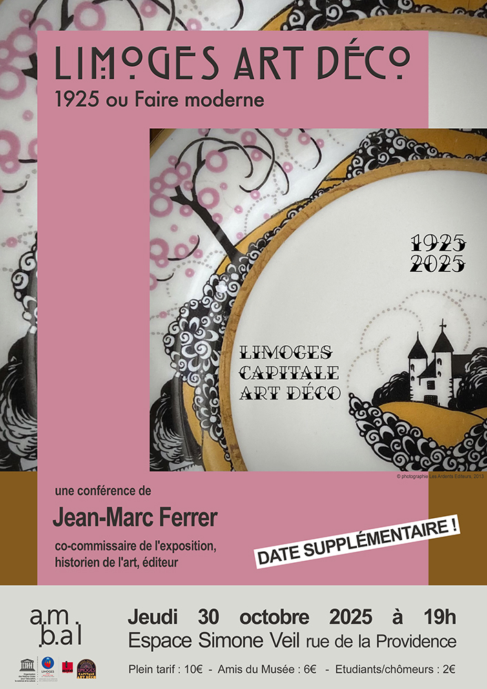 Suite au succès de la conférence du 01 octobre 2025, les Amis du Musée des Beaux-Arts de Limoges ont le plaisir de recevoir à nouveau Jean-Marc Ferrer, co-commissaire de l’exposition, historien de l’art, éditeur, pour une seconde conférence : “ Limoges Art déco. 1925 ou Faire moderne”.